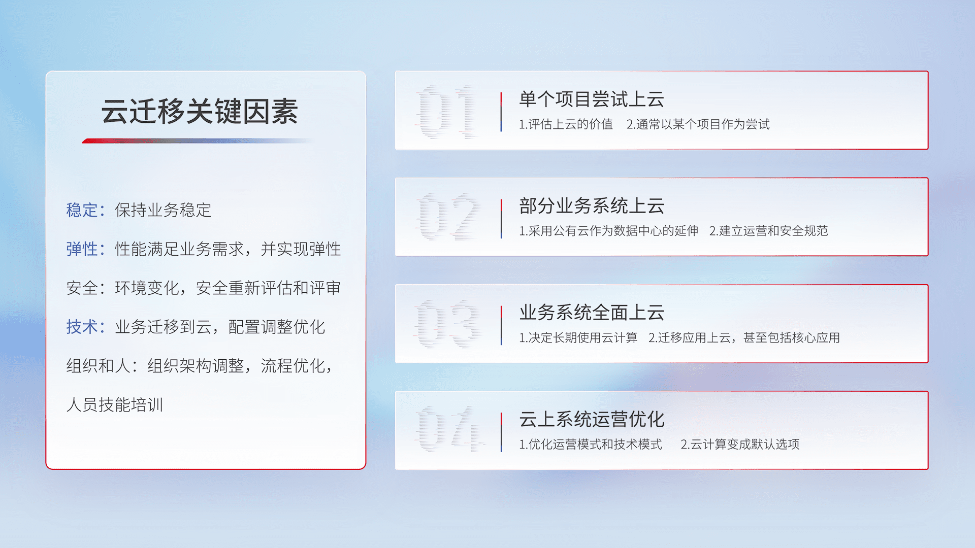 结合实际业务,,,,从规划设计、、云平台选型、、、、云原生改造、、、数据迁移、、、、集成交付,,迁移全过程为客户识别最佳上云路径,,做好风险识别管理,,设计网络架构、、身份权限、、、安全审计合规、、、、操作审计、、日志审计、、、、监控告警策略、、、、多站点容灾设计等,,对云上基础设施进行整体规划,,提升IT治理水平,,,以满足弹性、、高可用、、、、高性能的需求。。。。