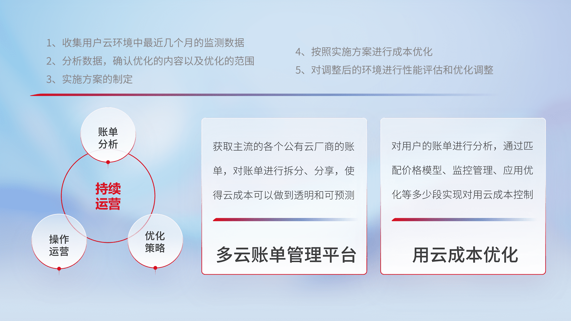 通过多云纳管,,以统一的资源数据模型把客户的云资源进行抽象和封装,,,进而实现对多云资源的统一操作,,,,保障云资源管理的可靠性、、稳定性与可用性。。。。量身定制化运维内容,,配置、、开发运维、、补丁管理、、备份、、监控、、、认证和访问管理、、审计和日常巡检等,,保障在用云过程中的可靠度,,,,稳定度以及高可用率。。