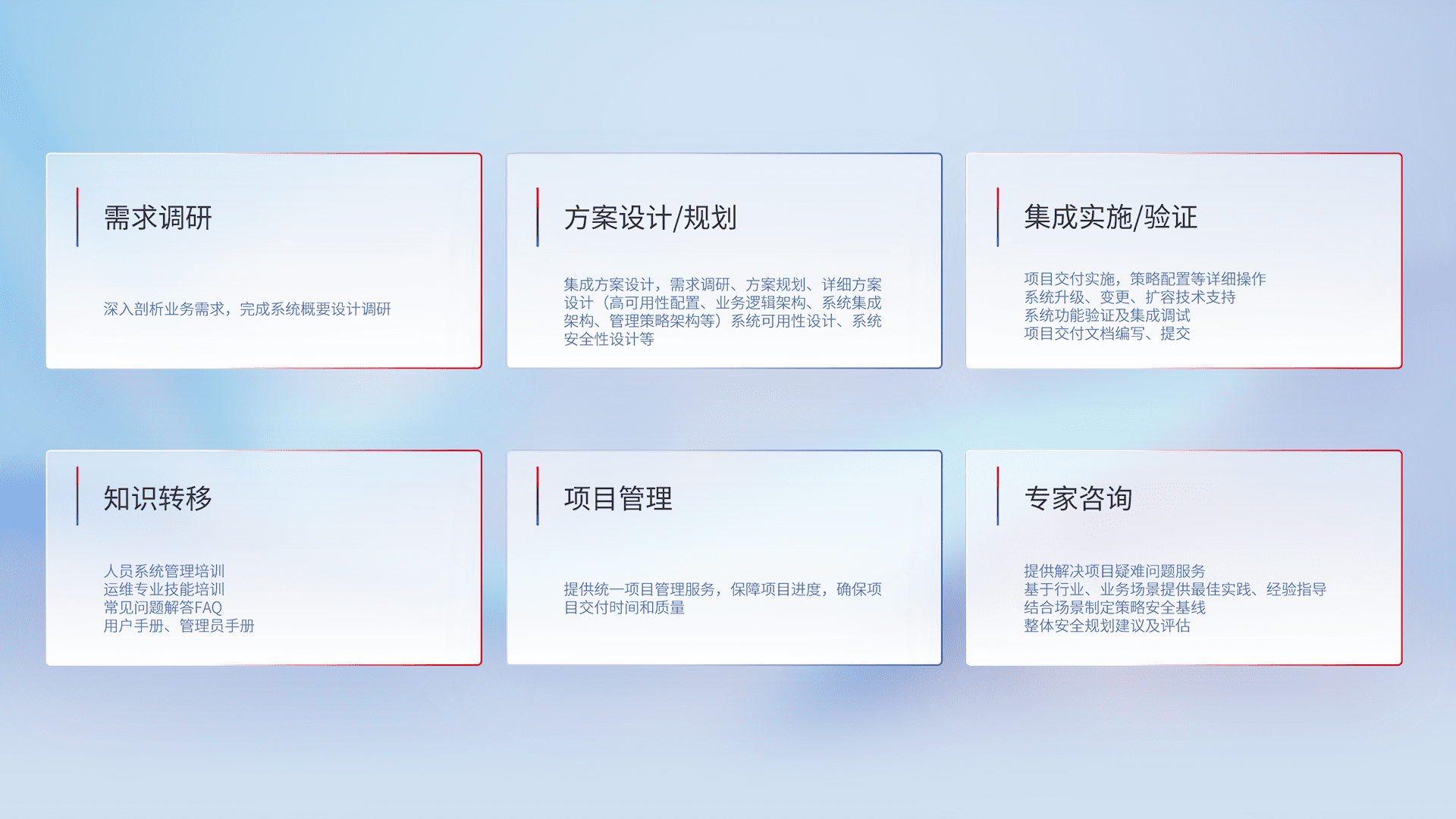 针对客户行业特性,,将宏观的安全战略和需求,,通过专业的交付服务,,,实现项目落地,,,,为客户提供标准规范的集成交付服务。。